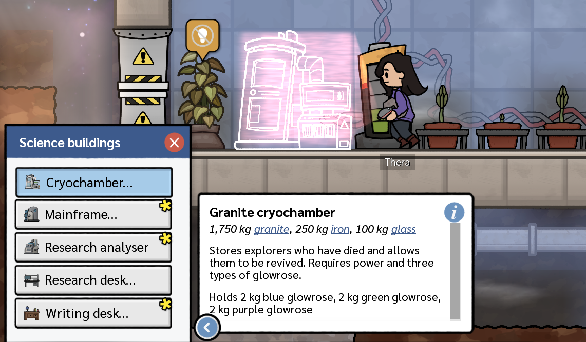 Buildings are now made out of different materials – and in some cases, more than one. When you start the game, everything will still be buildable with a single element (most likely you’ve crash-landed on granite) but as you unlock the research tree, more complex buildings will become available to you.