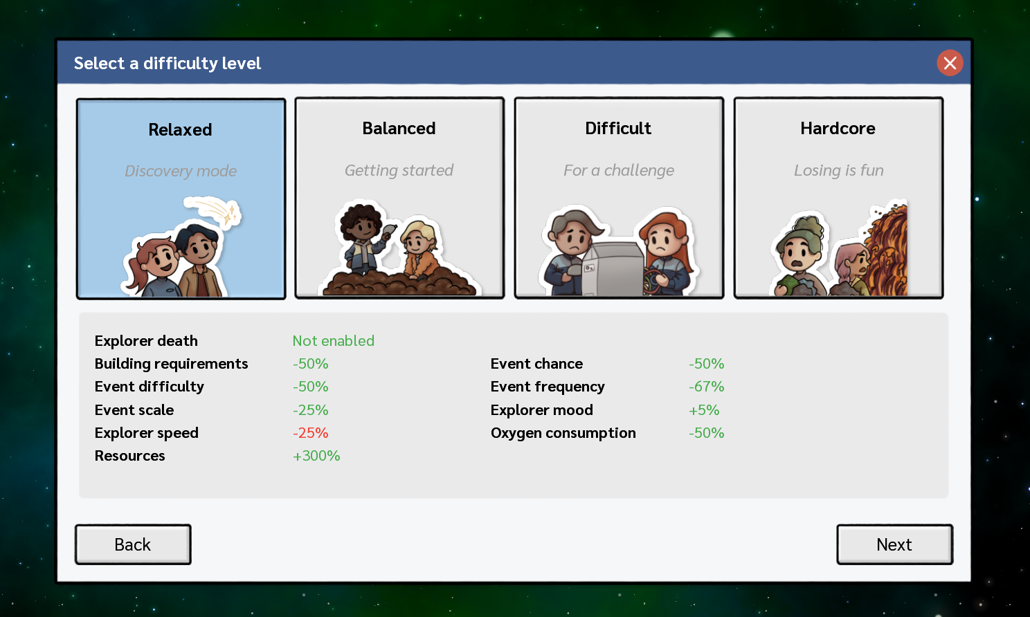 Relaxed: This difficulty level makes the game much less stressful, as explorers can no longer die. Random events are less frequent, and more likely to be positive; oxygen generation is easier; and the world is generated with many more resources. This is a great place to start if you’ve never played a game like Adaptory before.